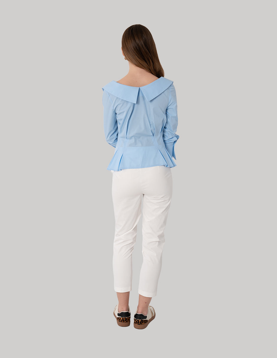 Chaleco con solapa clásica y cierre frontal con botón (disponible en azul y beige)