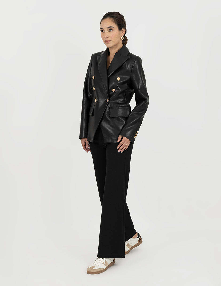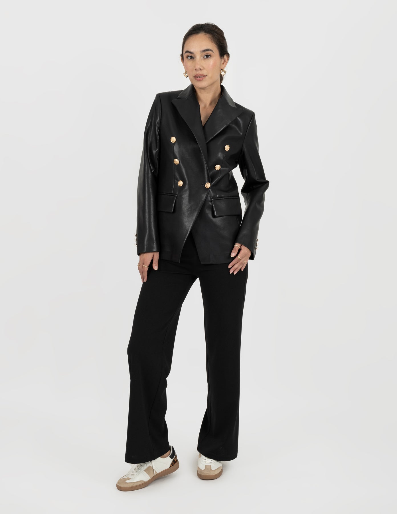 Uno de los detalles que más nos gusta de nuestro saco negro de vestir de vinipiel, es el cruce y los botones dorados, que le dan un toque muy vanguardista a nuestra prenda.