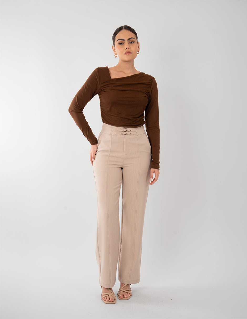 Blusa beige de manga larga y detalle de fruncido