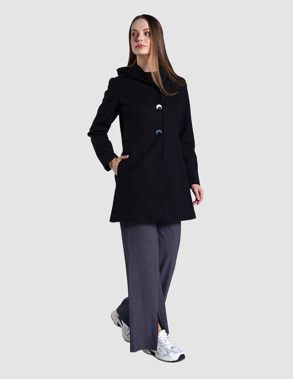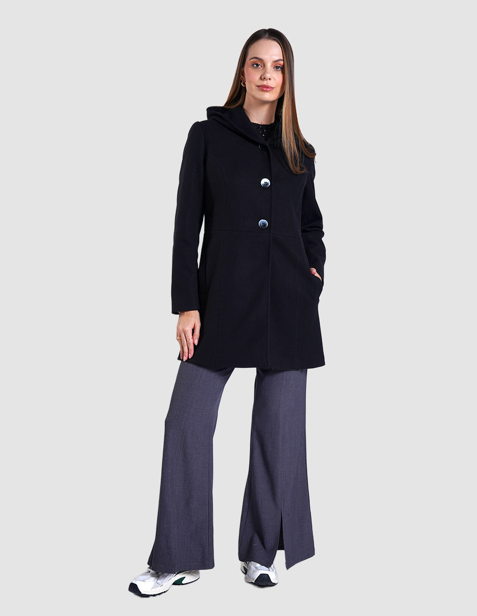 Nuestro abrigo negro largo con capucha, luce increíble con un pantalón, vestido, falda y/o tus jeans favoritos.