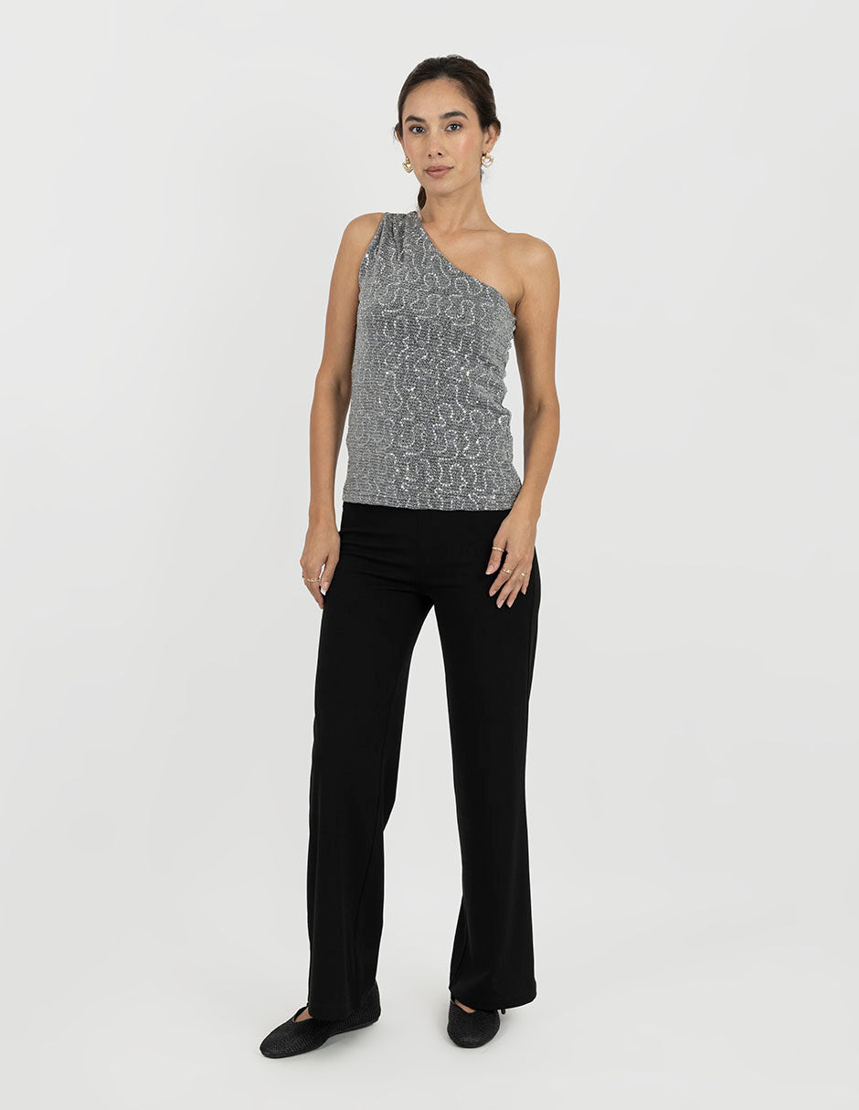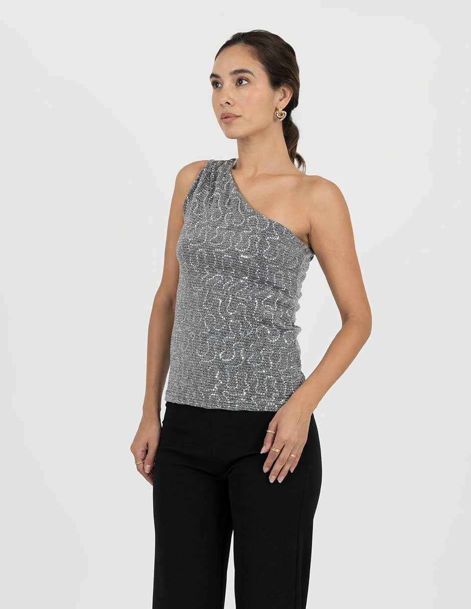 Nuestra blusa plateada asimétrica con brillos, luce increíble con un pantalón de vestir, falda y/o tus jeans favoritos.