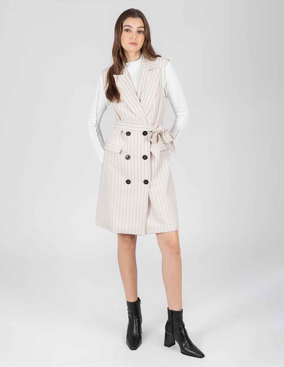 Nuestro vestido beige con botones y cinta, lo puedes lucir con una blusa si tienes mucho frío o sino, de manera natural, y tu chaqueta favorita.